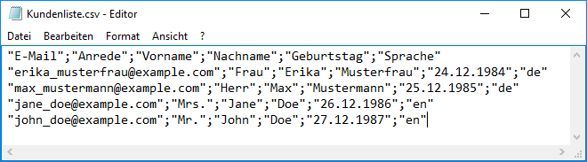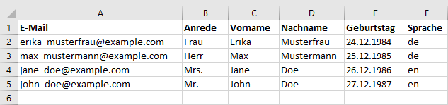 Abonnenten: ImportWahrscheinlich haben Sie bereits eine Liste von Adressen zusammengestellt, die Sie per Newsletter anschreiben möchten. Über das universelle CSV-Dateiformat lassen sich Ihre Adressen aus nahezu jeder Datenbank oder Tabellenkalkulation (z. B. Microsoft Office oder Open Office) exportieren und anschließend in digitalwert importieren. Um die Zuordnung der Spalten (z. B. Vorname, Nachname, E-Mail) beim Import zu erleichtern, sollte die erste Zeile Ihrer CSV-Datei aussagekräftige Spaltenüberschriftten enthalten. Ein Beispiel:
