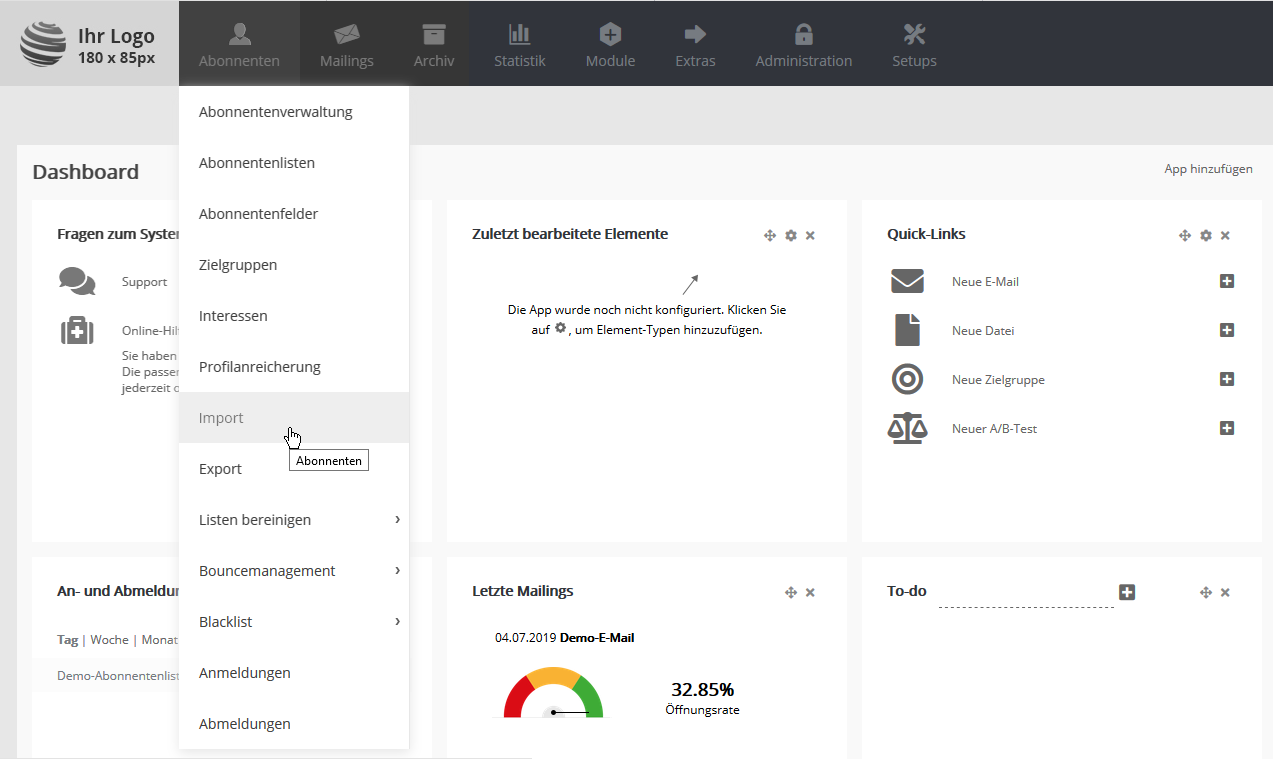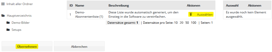 Schritt 3 - AbonnentenlistenWählen Sie nun aus, in welche digitalwert Abonnentenliste ihre CSV-Datei importiert werden soll. Falls Sie zuvor keine eigene Abonnentenliste in digitalwert angelegt haben (siehe Menü Abonnentenlisten), steht zum schnellen Einstieg die leere Abonnentenliste 'Demo-Liste' bereit. Diese Liste wird in der Regel bei der Einrichtung Ihres digitalwert Kontos angelegt und zur Demonstration mit einem Beispiel-Abonnenten befüllt.
