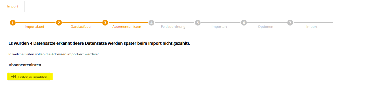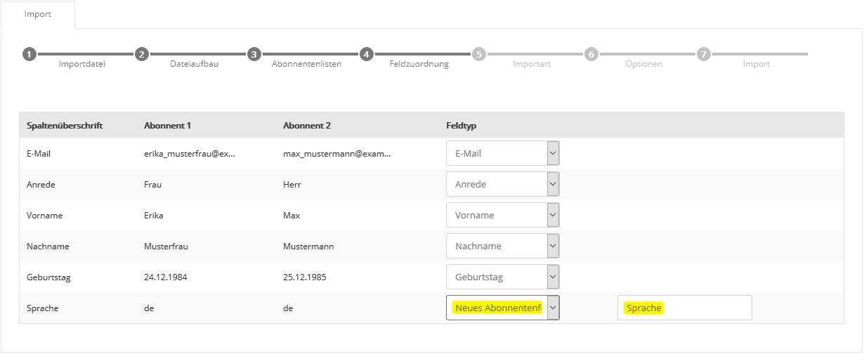 Auch die Auswahl mehrerer Abonnentenlisten ist möglich, falls Sie parallel in mehrere Listen importieren möchten. Klicken Sie nach Auswahl der gewünschten Liste(n) auf 'Übernehmen' und anschließend auf 'Weiter'. Der Name einer Abonnentenliste lässt sich im Menü Abonnentenlisten auch nachträglich jederzeit ändern. Schritt 4 - FeldzuordnungIn Schritt 4 teilen Sie digitalwert mit, welche Spalte (z.B. Vorname, Nachname) Ihrer CSV-Datei in welches digitalwert Abonnentenfeld importiert werden soll. Zum schnellen Einstieg sind typische Abonnentenfelder wie 'E-Mail', 'Anrede', 'Vorname' und 'Nachname' in digitalwert bereits vorhanden.