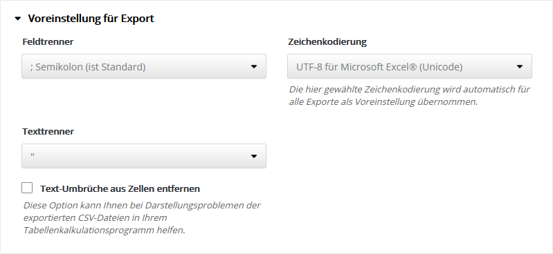 Folgende 'HTML-Editoren' sind in digitalwert integriert und nutzbar: Grundeinstellung ExportHier legen Sie die Voreinstellung für den Export von CSV-Dateien fest, z. B. für den Export von Abonnentendaten. Bei der Durchführung jedes Exportes können Sie bei Bedarf auch eine abweichende Einstellung wählen. Standardeinstellung ist die Option 'UTF-8 für Microsoft Excel® (Unicode)', technisch gesprochen 'UTF-8 mit BOM'. Dieses Format wird von den meisten Officeanwendungen automatisch erkannt, so dass Umlaute und Sonderzeichen ohne manuelle Formatwahl korrekt importiert werden. StatistikeinstellungenTragen Sie Ihre eigenen Maximalwerte ein, um die rot|gelb|grün Farb-Umschaltung der Statistik-Anzeige für Öffungsrate, Klickrate und Bouncerate an die typischen Werte Ihrer Mailings anzupassen. Nur Ihre besten Mailings sollten den grünen Bereich erreichen. Die Farb-Umschaltung erfolgt automatisch in Drittel-Stufen des eingetragenen Maximalwertes. Empfehlung: Notieren Sie aus der Statistik Ihrer bisherigen Mailings die Durchschnittswerte für Öffnungsrate, Klickrate und Bounces. Damit dieser Durchschnittswert zukünftig im mittleren Drittel der Skala landet, tragen Sie das Doppelte dieses Wertes als Maximum in das jeweilige Feld ein. Tragen Sie z. B. 30% als Maximum ein, dann werden anschließend die Werte bis 10% rot, bis 20% gelb und darüberliegende Werte grün gefärbt. Sie sehen sofort, ob Ihr aktuelles Mailing über- oder unterdurchschnittlich abschneidet. Typische Durchschnittswerte: