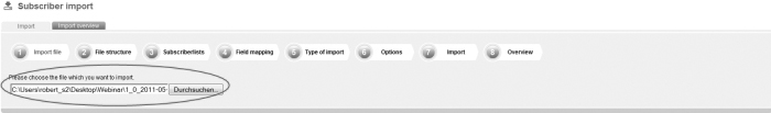 Save the file as a file with the feature 'CSV (Comma delimited)'. Apple user: If you own an apple computer, you will have to safe the file as 'CSV-Windows'. digitalwert does not run files in the Mac format. Step 1 – Import fileOn the navigation bar click on 'Subscribers' and then go to the navigation subitem 'Import'. This is the way how you get to the menu-guided import function of digitalwert. First, you will have to choose the file which you want to import; |