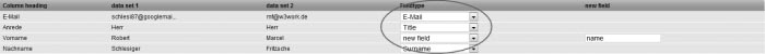 if the first line of your address file contains (as shown in the example above) the column headings, leave the item 'First line contains column headings' marked . Otherwise, if your address file starts right away with the subscriber data, unmark this option. Step 3 – Subscriber ListsChoose the subscriber list to which you want to import the addresses. Subsequently click on 'Next'. Step 4 – Field MappingNow you are asked to match the field names of your subscriber data with those of digitalwert. In order to do so, please choose in the drop down menus the associations which correspond to field information displayed to the left of these menus. If there does not exist a matching subscriber field, choose 'New Field' and enter a name for the subscriber field that needs to be created. Click 'Next'.