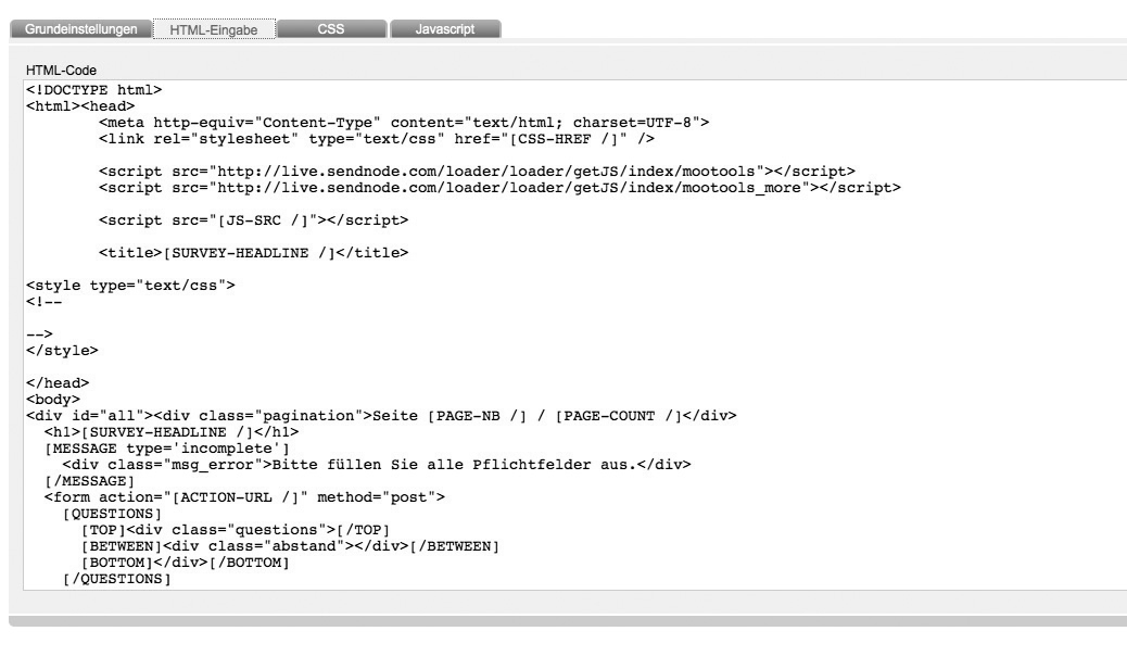 Insert your entire html source code. By creating a new template, digitalwert generates a sample html source code with all important survey-placeholders automatically in this tab.