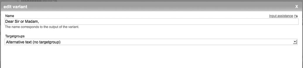 Here you enter detailed definitions of your personalizations. Click 'create variants' to open a new tab, where you can enter your wanted settings. Create your title by using the 'input assictance' into the name-field. Take a look at our example 'Hello [Vorname]':