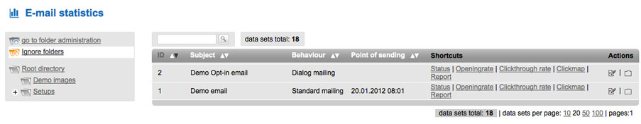 Here you find the statistics of all sent mails. For easier access digitalwert already includes a demo-mail you can view. |