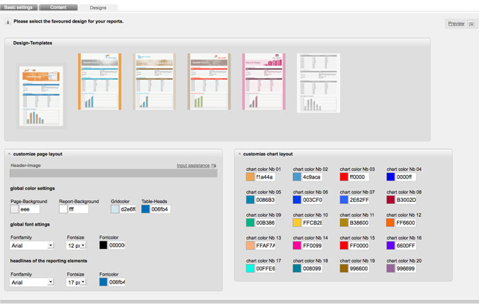Now you also can adjust the design of your report. Choose the tab 'designs'. By default digitalwert suggests you six different layouts. HTML experts can also open the 'advanced settings' below the layouts to edit the html-code. For example you can insert your logo in th header.