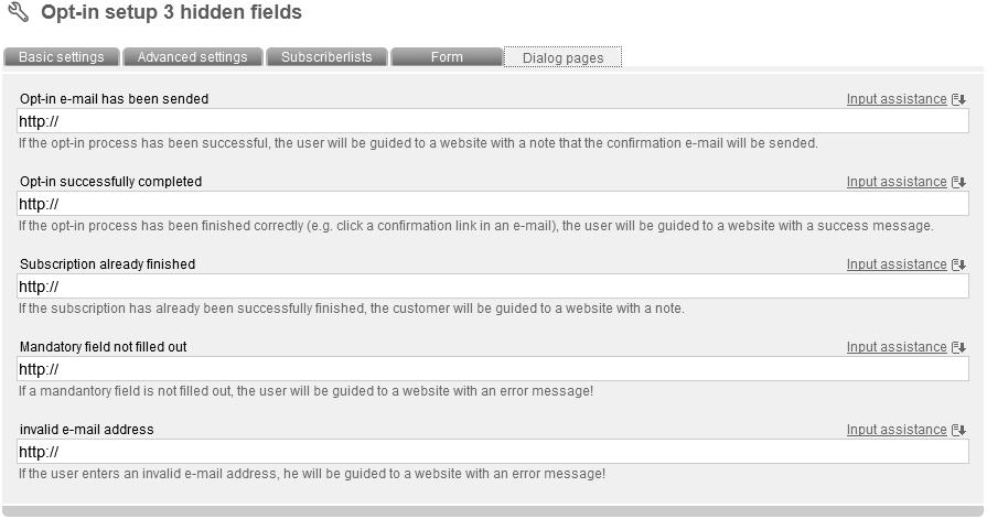 Now enter a name and an optional description for your optin setup. Then choose the 'mode' (important). The following modes are supported by 'digitalwert': Double Opt-in with confirmation e-mail (recommended as the only legally secure login variant): Interested party visits a website with an optin setup form. He enters his data into the form. He gots an e-mail with content like this: „Thank you for your optin. Please confirm the registration confirmation link to complete your registration.“ He clicks the link. Registration is completed. He gots a „welcoming“ e-mail. You can integrate information about your company and a certain design as well. Double Opt-in: Like described before, but without sending of a „welcoming“ e-mail. Confirmed Opt-In: Nach Anmeldung auf der Webseite wird sofort eine automatische Begrüßungsnachricht versendet. Single Opt-in: No e-mails will be send. There just will be a message in your browser, that registration was successfull. According to the mode you've choosed, you have to adapt different sub-options. In Tab 'advanced settings' you can deposit your e-mail address in field 'e-mail forwarding', to be informed about new subscribers. In field 'mailing for later delivery' you can determine your last sended newsletter. All new subscribers will receive your last mailing and don't have to wait for another one. To protect your optin-form against abuse, activate the invisible captcha . Captchas are often used to check if petitions are produced by a machine (robot, short: bot) or a real person. Bots are often used abusive to generate masses of subscriptions. Choose your favorite subscriberfields, which should be filled in in next tab 'Form'. After clicking 'Add subscriberfield' a pop up appears, where you can select and add subscriberfields to your optin-form. Furthermore you can add one or more subscriberlists as option(s) in a ceckbox through the button 'add subscriberlist'. Click 'sort formfields' to edit order of your fields. Click 'test form' to check your form by a preview of your optin-form. Next tab: 'Dialog pages':