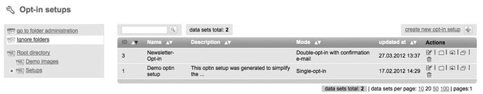 Through 'Setups' and 'Optin Setup' you can create forms, which can be included into your website. So interested parties can login automatically on your website for your subscriberlist(s). Please note: Requirement for a successfull 'optin setup' is to create an e-mail with type 'dialog mailing' for registration confirmation and welcoming, which got the status 'activated'. Otherwise those mailings will be lacking in the shortlist of mailings which you can choose for your optin setup. For an esier start digitalwert gots a „Demo optin setup“ for you. Created optin setups can be 'opend' afterwards for editing, 'moving' to another folder or 'deleting'. If you have moved an optin setup into another folder, click 'open folder' to get into. Create new Optin setup |